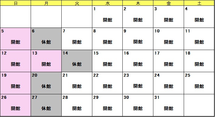 休館日/毎週月曜日 (祝日の場合は翌平日) 年末年始 (12月28日~1月4日)