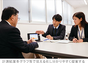 計測結果を踏まえ、運用の改善や設備の更新など、お客さまにとって最適な省エネ提案を行うが、その際に彼らが大切にしているのは、お客さまと直接顔を合わせて意思疎通をしっかり行うことだ。「直接お会いすれば、絵を描いて伝えたり、複数の意見を同時に聞いたり、また別の困りごとを聞けたりと、メールや電話では難しいことも可能になる」。伝える言葉も専門的な言葉や単位を用いるのではなく、「この明るさは晴れた昼間の明るさ」、「この音はバスが走っているぐらいの大きさ」と、身近なものに例えて分かりやすく伝える工夫をしている。