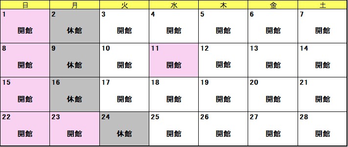 休館日/毎週月曜日 (祝日の場合は翌平日) 年末年始 (12月28日~1月4日)