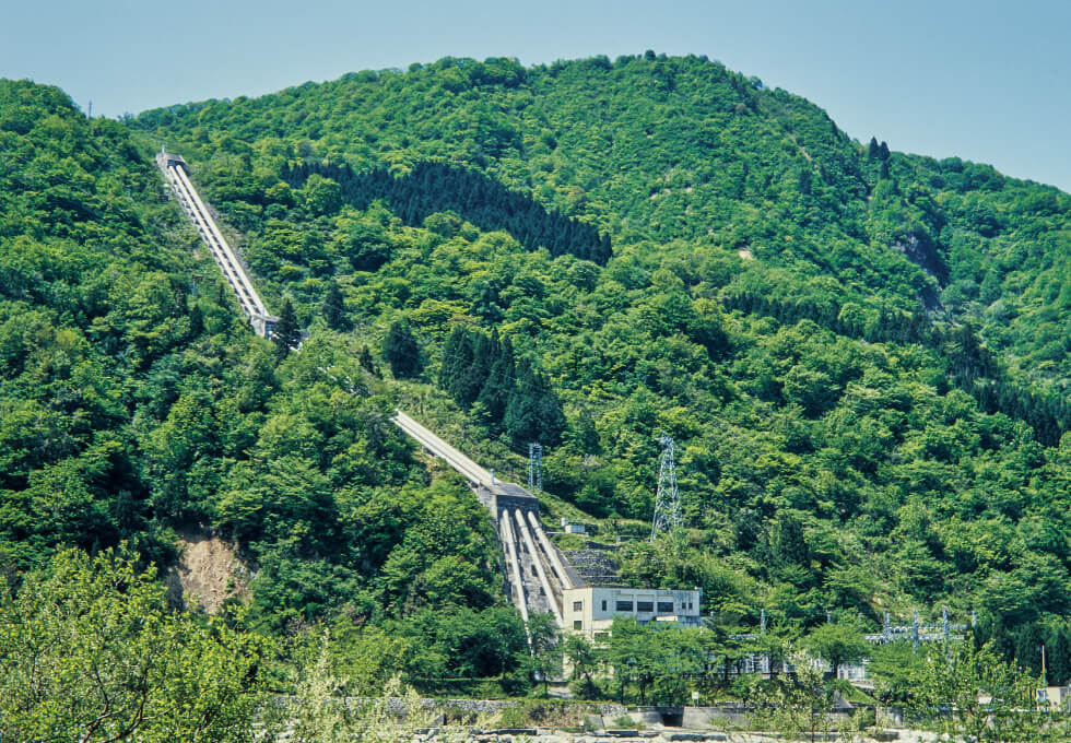 なかでも,1954年(昭和29)1月,2月に相次いで運転を開始した神通川第一(8万kW)・神通川第二(4万kW)発電所は,ほかの開発地点に比べて出力が格段に大きく,北陸電力初の本格的な調整池式発電所でありながら,建設開始から22か月という短い工期で工事を完成し,その技術力の高さが注目されました。神通川第二発電所と,1955年(昭和30)に完成した神通川第三発電所は,上流の第一発電所から放流される水をいったん神二ダム,神三ダムに溜め,これを平均に放流しながら下流の灌漑用水の流量調整を行う逆調整用発電所としての機能も果たしています。