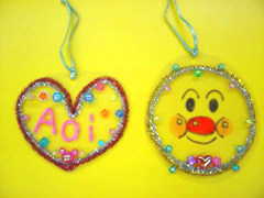 女の子に人気があったのは、好きな色のキラキラビーズで作る「ビーズクラフト」で、ビーズをモールに通して色々な形にし、キーホルダーのチェーンをつけて出来上がりです。