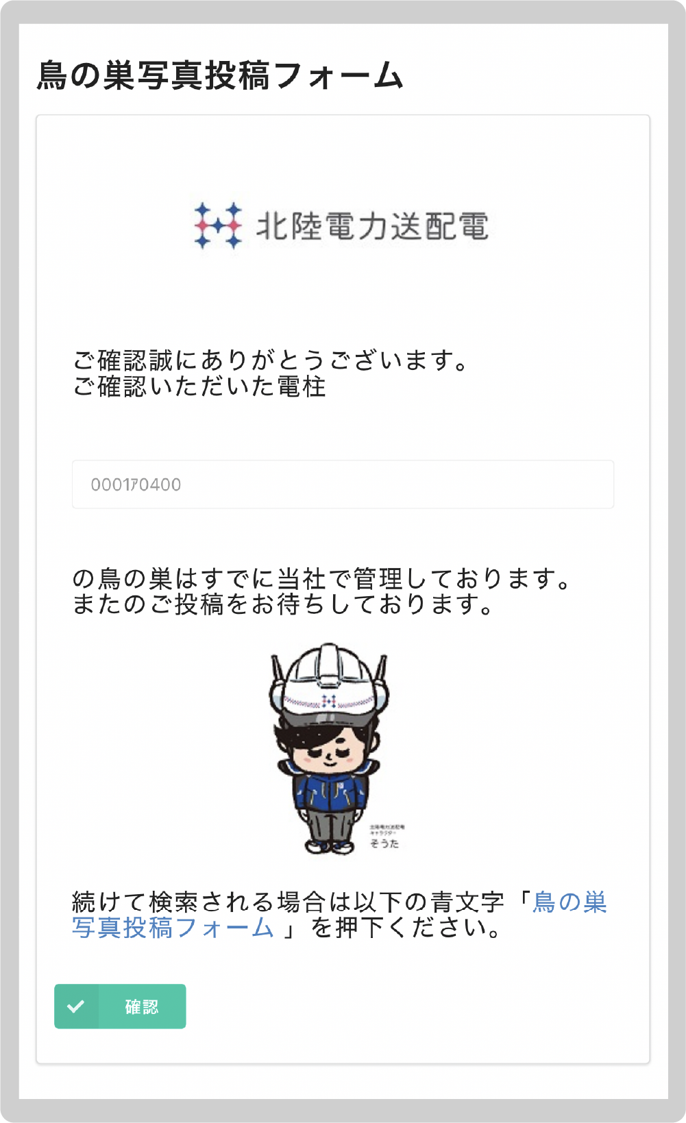 - STEP1)投稿フォームへアクセス:鳥の巣を発見した電柱番号を入力し検索