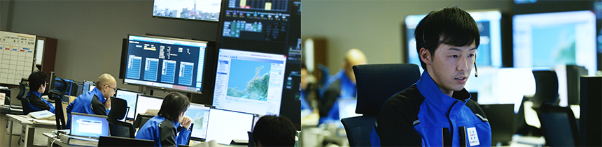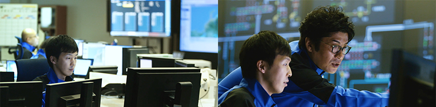 安定供給のために、気象予報を常にチェックしながら、翌日、週間の需要予測を立てて、変動分にも対応できる発電量を確保。当日は需要等の変化に合わせて、発電調整を行っています。また、系統事故による停電時には、迅速に、的確な復旧操作を行えるよう、送電線や変電所などの系統状態も逐一監視しています。