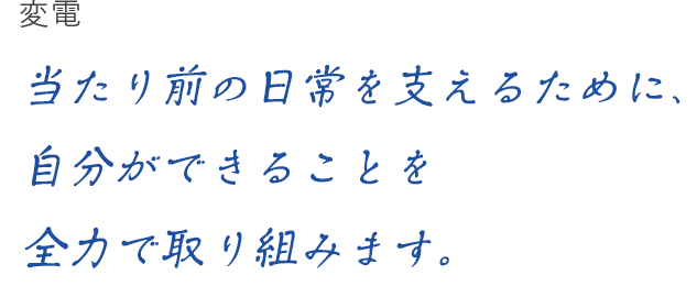 この仕事は,新しいものを発明したり,生活に劇的な変化をもたらすようなものではありません。ただ、10人いたら10人全員が必要だと感じるものを提供する仕事だと思っています。実際、仕事中にお客さまと話をする機会はほとんどありませんが、住民の方の当たり前の生活、日常を陰から支えているという自負を持って、全ての仕事に対して後悔しないよう、自分にできることを100%出し尽くしたいと思っています。
