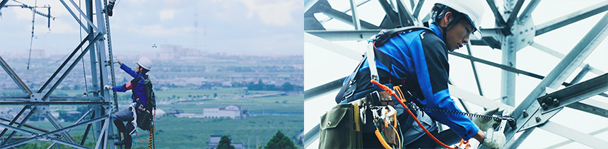 山間部の巡視は基本二人一組で、一人が鉄塔に昇り、もう一人は付近の鉄塔の異常がないかを確認します。高い鉄塔は110mのものもあるので、安全を最優先に交互に作業を行うという役割分担を徹底しています。いざという時にチーム力が一番大事になってくるので、普段からの何気ない声掛けなど、コミュニケーションを何よりも大切にしています。