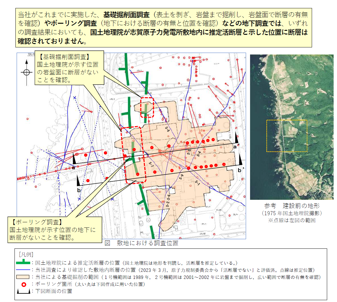 ・当社は、空中写真判読などの地形調査に加え、ボーリング調査や基礎掘削面調査等の複数の詳細な地質調査を行っており、志賀原子力発電所の敷地内には、活断層が存在しないことを確認しております。